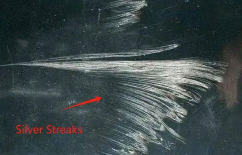 Streaks in Injection Molding are those in which water, air, or char is distributed in the direction of flow along the surface of the part.